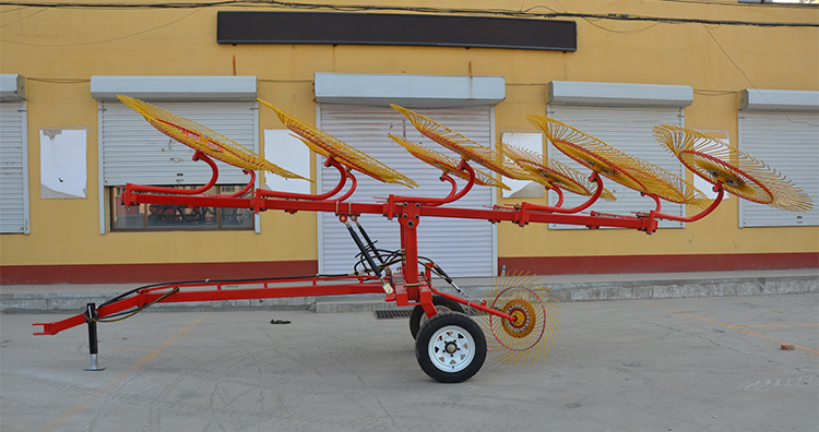 Тхетрактор точакПогодни су за причвршћивање на уређај за суспензију у три тачке трактора на котачима. Радне компоненте су дискови прстију зубима. Машина преноси силу из диска прста до следећег у низу док се не формира лабава и прозрачна трака травнате трака. Промјена угла диска прста може подесити ширину травне траке. Зуби су дуго прољетни челични зуби са добрим ефектом шиљасте и јаке перформансе обликовања. Зуби су распоређени радијално на чворишту, што може да елиминише утицај ветра и олакшава пролазак прашине. Притисак на земљу по диску прста контролише се напетости пролеће. Под притиском се може подесити плочицом за подешавање истезања у складу са усевима и основним условима.